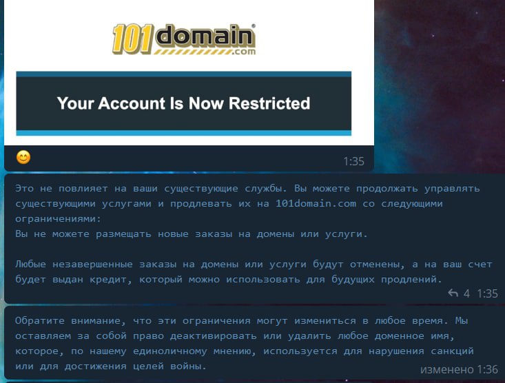 March 10, 20223 yr Что ни час так очередная новость со знаком ➖ Тревожная новость от регистратора 101domain. Они пишут, что по старым услугам без изменений, но новые домены для пользователей РФ недоступны, так же они оставляют за собой право разделегировать любой домен. У кого там домены, держите руку на пульсе... Ичточник: Телеграм Бабло побеждает зло!