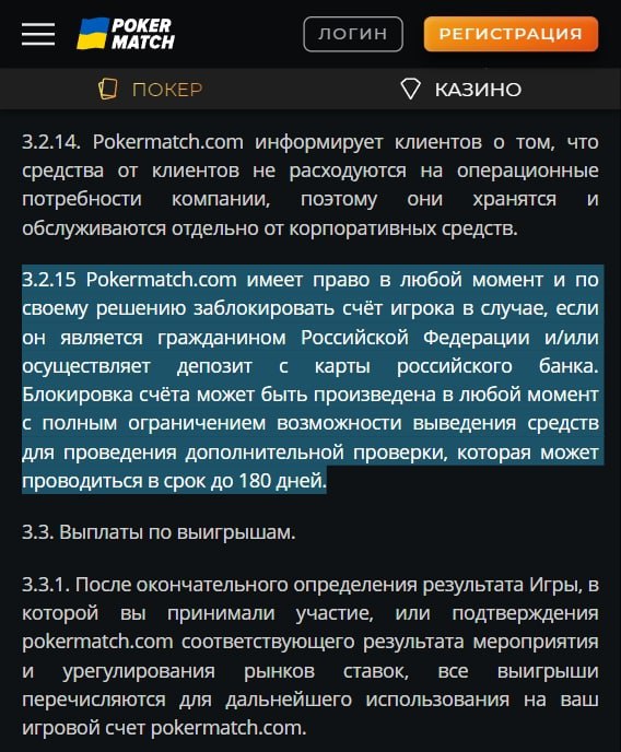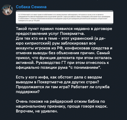 March 28, 20223 yr Ха, даже ренат закоментил, плюсую! Цитата Такой пункт правил появился недавно в договоре предоставления услуг Покерматча. Для тех кто не в теме - этот украинский (а де-юро киприотский) рум заблокировал все аккаунты игроков из РФ, конфисковав средства и отменяя выводы без объяснения причин. Самый прикол, что функция депозита при этом осталась активной. Руководство ГТ при этом отнеслось к официально позиции рума "с пониманием". Есть у кого инфа, как обстоят дела с вводом выводом в Покертматче для других стран? Продолжается ли там игра? Работает ли служба поддержки? Очень похоже на рейдерский отжим бабла по национальному признаку, проще говоря кидок. Впрочем, не удивлен. Edited December 4, 20222 yr by Luger