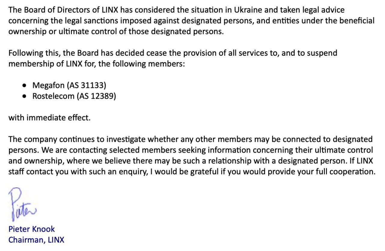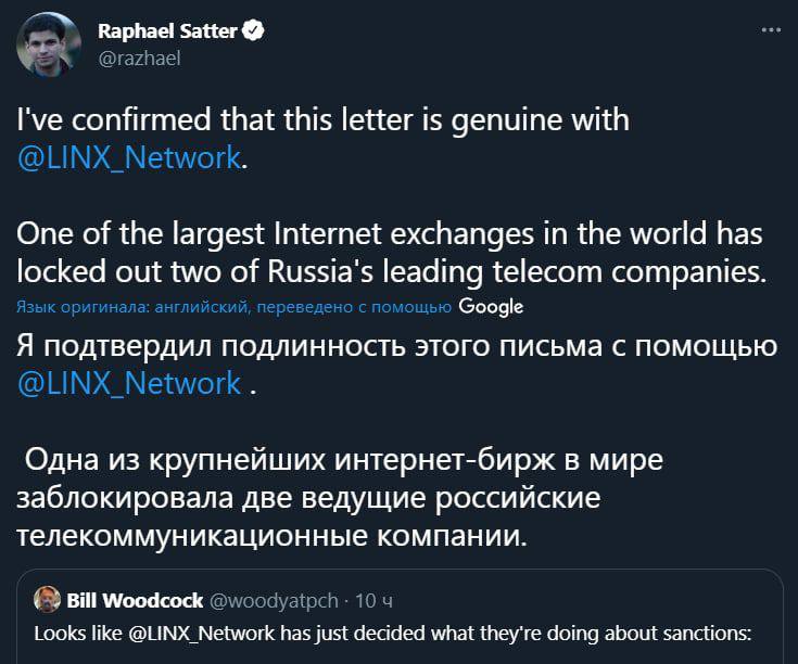 March 12, 20223 yr В России резко упадет скорость интернета. LINX (London Internet Exchange - Лондонская биржа Интернета) подтвердила отключение ключевых провайдеров РФ (Ростелеком и Мегафон) от точки международного обмена трафиком. Теперь трафик пойдет через Азию, а это означает падение скорости и рост зависимости от Китая.