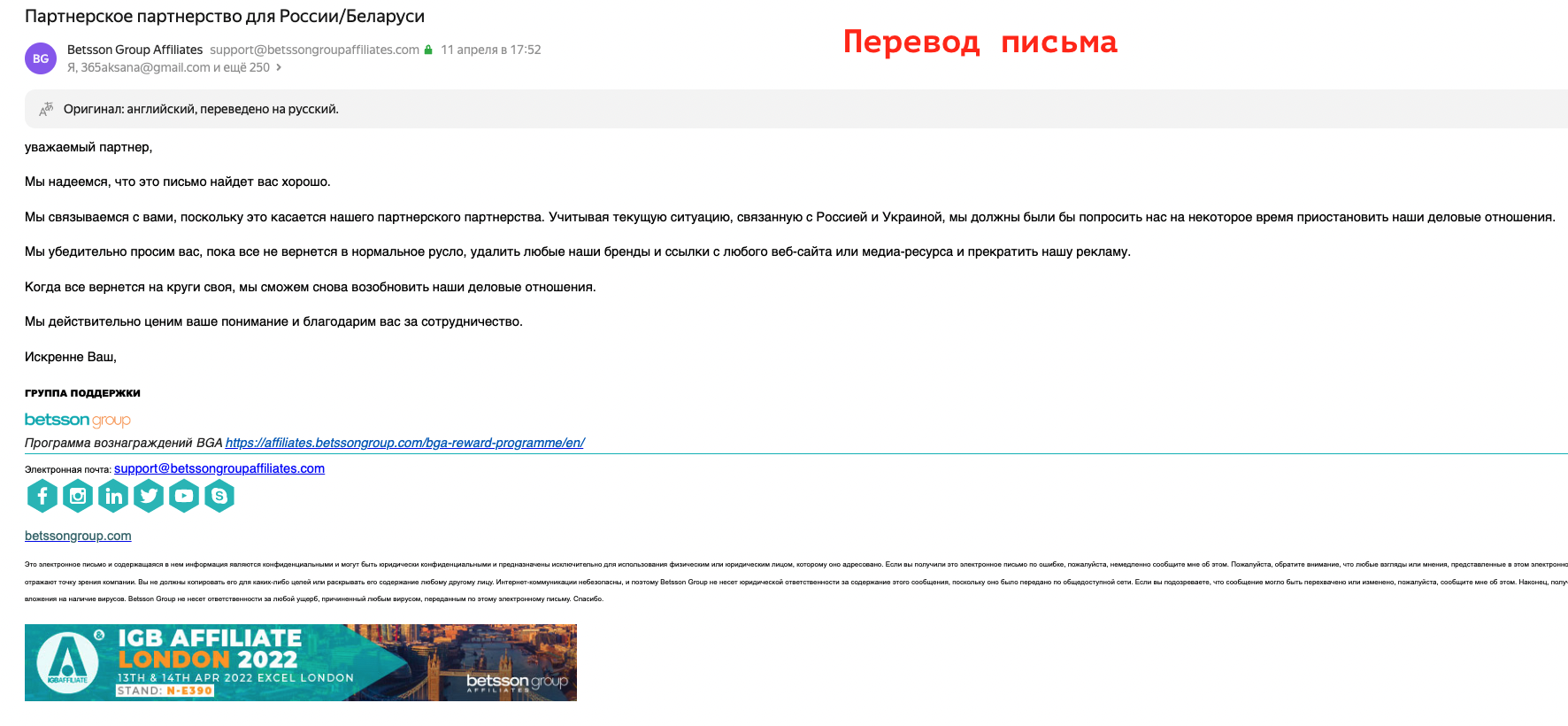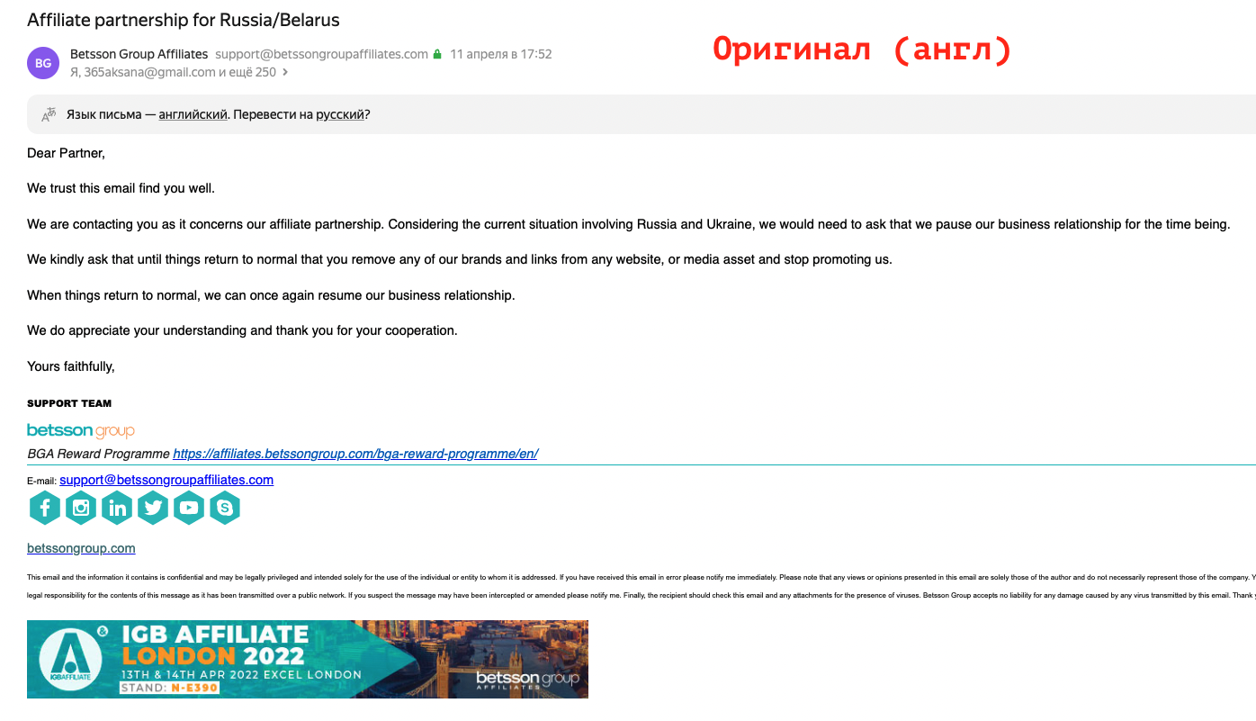 May 2, 20223 yr Около месяца назад пришло письмо от партнерки Betsson Group Affiliates, но все никак не доходили руки описать этот скам. И вот вкратце... Betsson Group Affiliates это зарубежная (бурж) партнерка по онлайн казино, причем одна из самых древних и весьма популярных. 11 апреля 2022 года у них в голове что-то бахнуло, либо прилетело давление "свыше" (что мало вероятно тк много других партнерок работают как работали), в общем они решили полностью разорвать контракты для партнеров из России и Белоруссии. При чем сделали быстро и резко одномоментно! Это ни что иное как чистое кидалово и мошенничество, очень много российских партнеров после ужесточения условий работы в РФ (баны от РКН, отключения платежек итп) стали активно продвигать "буржей", и 90% из которых по любому имели в своем арсенали и Betsson Group Affiliates. Еще раз подчеркну, деньги которые партнер зарабатывал по программе "ревшара" и пассивный доход который он имел, его наглым образом отжали. Смешно читать было вот этот отрывок из их письма: Цитата Когда все вернется на круги своя, мы сможем снова возобновить наши деловые отношения. Я хз, кому они на%%й после такого кидка будут нужны, на моих же проектах, они однозначно отправляются в черный список навечно.