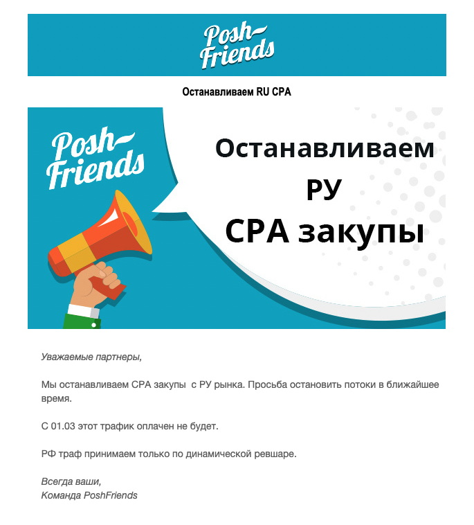 February 28, 20223 yr Очередное "приятное" письмо, на фоне ситуации на Украине. Сразу цитирую: Цитата Уважаемые партнеры, Мы останавливаем СРА закупы с РУ рынка. Просьба остановить потоки в ближайшее время. С 01.03 этот трафик оплачен не будет. РФ траф принимаем только по динамической ревшаре. Всегда ваши, Команда PoshFriends