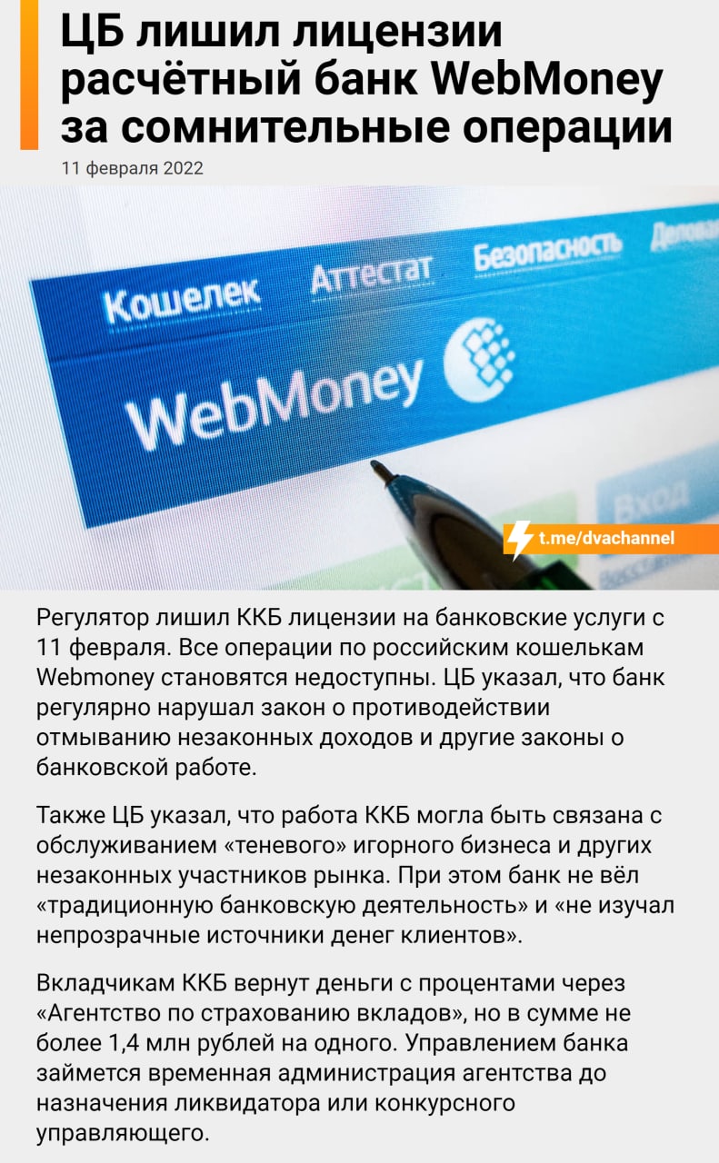 February 11, 20223 yr Author ЦБ лишил лицензии расчётный банк WebMoney за сомнительные операции. Консервативный коммерческий банк (ККБ) – расчетный банк платежной системы WebMoney – лишился лицензии. Ранее ЦБ РФ приостанавливал в банке на полгода операции пополнения и перевода электронных средств платежа. ЦБ РФ отозвал лицензию ККБ из-за нарушения законов – кредитная организация была замешана в отмывании нелегальных доходов, обслуживании теневого финансового рынка и нелегального игорного бизнеса.