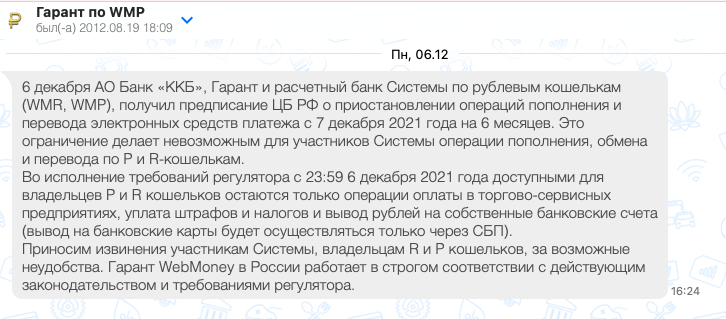 December 7, 20214 yr Author WebMoney приостанавливает действие WMR и WMP кошельков На днях получил очередное грустное письмо... По требованию ЦБ РФ, WebMoney приостанавливает основную деятельность по операциям для рублевых кошельков (WMR и WMP). Цитирую письмо: Цитата 6 декабря АО Банк «ККБ», Гарант и расчетный банк Системы по рублевым кошелькам (WMR, WMP), получил предписание ЦБ РФ о приостановлении операций пополнения и перевода электронных средств платежа с 7 декабря 2021 года на 6 месяцев. Это ограничение делает невозможным для участников Системы операции пополнения, обмена и перевода по P и R-кошелькам. Во исполнение требований регулятора с 23:59 6 декабря 2021 года доступными для владельцев P и R кошельков остаются только операции оплаты в торгово-сервисных предприятиях, уплата штрафов и налогов и вывод рублей на собственные банковские счета (вывод на банковские карты будет осуществляться только через СБП). Приносим извинения участникам Системы, владельцам R и P кошельков, за возможные неудобства. Гарант WebMoney в России работает в строгом соответствии с действующим законодательством и требованиями регулятора.