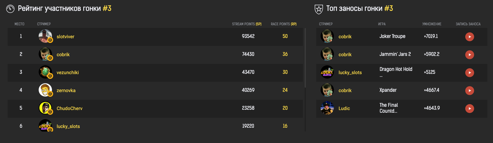 August 4, 20214 yr Гонка стримеров по казино онлайн StreamRace 11 финишировала! Лучшие стримеры сражались в казино Play Fortuna за большие деньги 💰 slotviver 60 000$ cobrik 36 000 $ vezunchiki 18 000 $ zernovka 9 000 $ Axellych 7 000 $ lucky_slots 6 000 $ Ludic 5 000 $ Buratino 4 000 $ ChudoCherv 3 000 $ BODGIK 2 000 $ Призы уже начислены на аккаунты в партнерской программе Gambling Craft 👌 Благодарим всех стримеров за участие в этой эпичной гонке! PS: Призы за X квесты также начислены